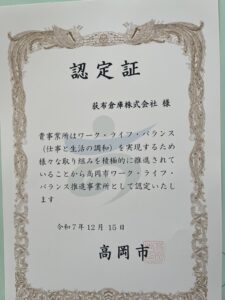 この度、弊社は富山県高岡市が推進する「ワーク・ライフ・バランス推進事業所」に認定されましたことをお知らせいたします。